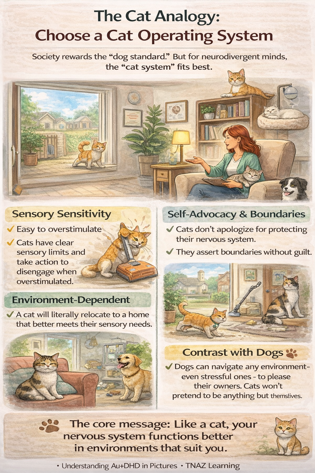 We are no different from our pets. Yet, for most of our lives, neurodivergent people are told we need to be more like the dog: flexible, social on command, and tolerant of any environment. But what if the key to our well-being lies in embracing our inner cat?