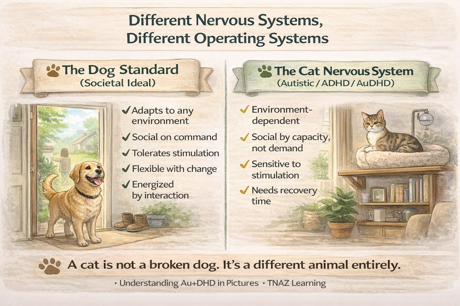 Neurodivergent brains are not neurotypical brains that went wrong in the factory. They are wired differently from the ground up. Trying to live by neurotypical rules is like a cat trying to live by a dog's rules—it leads to exhaustion and a deep sense of being "wrong."