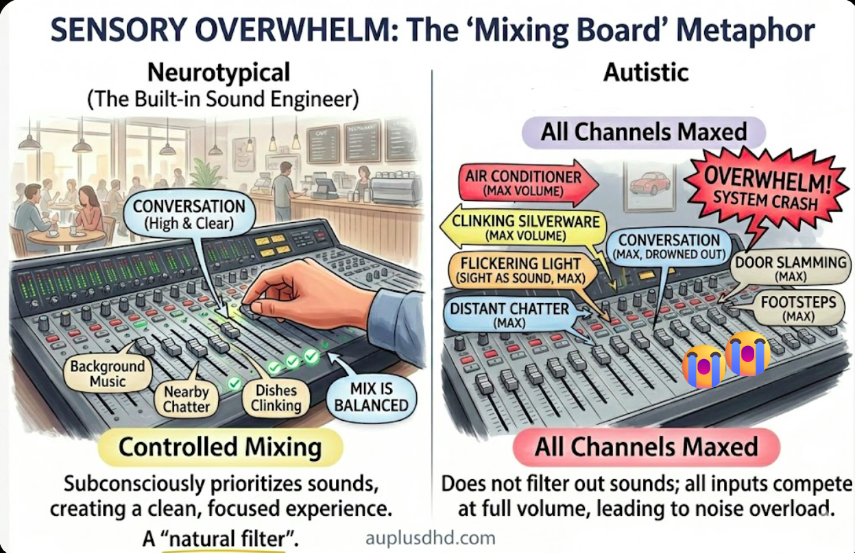 The Insight: For the Autistic brain, those faders are often pushed to 100% volume across the board. You aren't "choosing" to hear everything; your board simply doesn't have a "down" button.